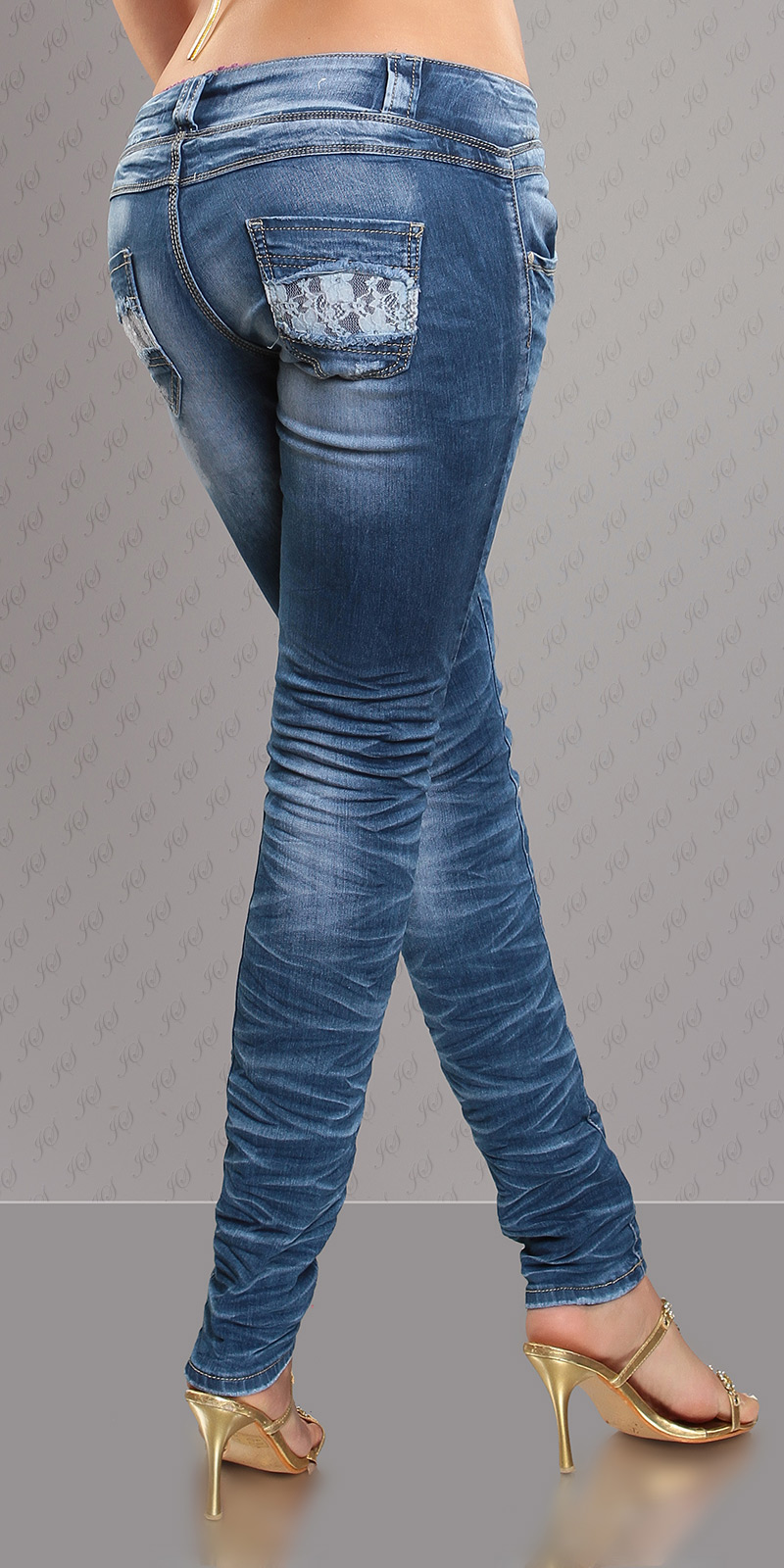 Tex. spetsbeklädda bakfickor. Små dekordragkedjor på framsidan.